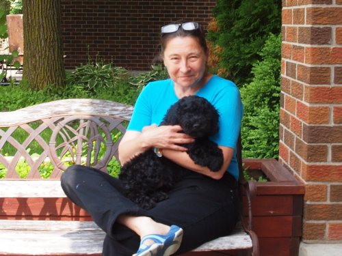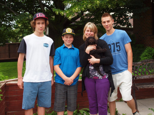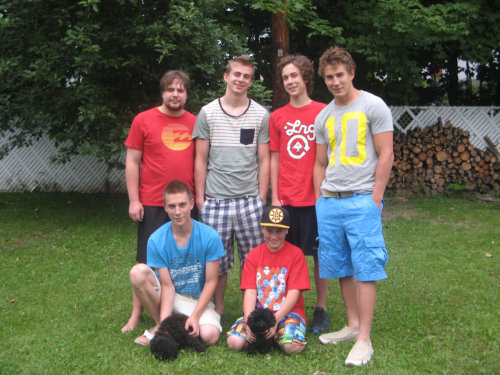 Marlie with all six sons - Guillaume, Gabriel, Francis, Anthony, Vincent, Simon-Nicholas. And their other dog and Marlie's new friend Mousseline Isosceles Dancing - now known as Marlie - with Line,Francis, Vincent and Simon